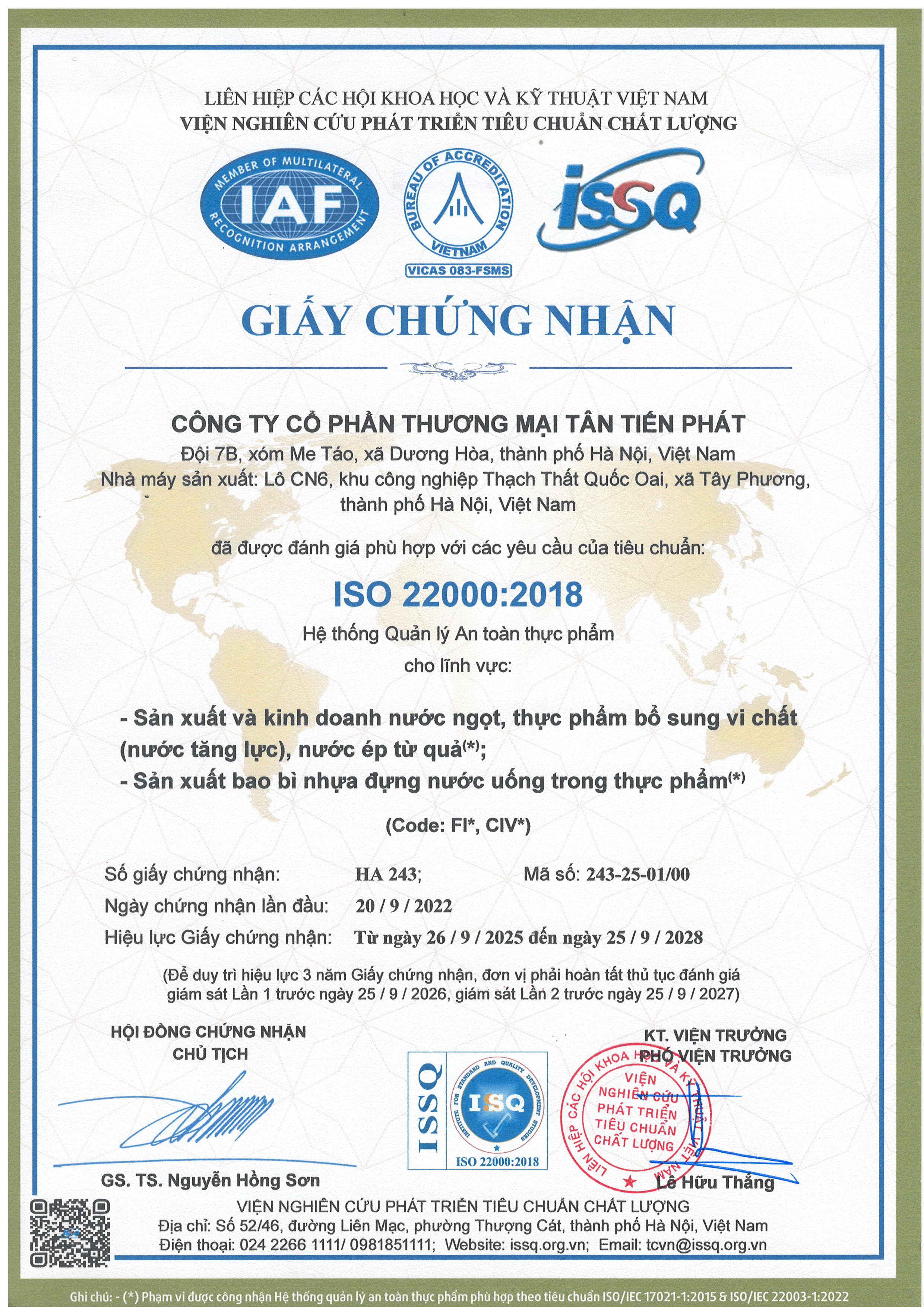 ĐC: Đội 7B, thôn Me Táo, xã Dương Liễu,huyện Hoài Đức, TP Hà Nội NM: Lô CN6, khu CN Thạch Thất - Quốc Oai, TP. Hà Nội MSDN: 0500475957 ĐK lần đầu: 20/12/2015 ĐK thay đổi lần thứ 9: 08/11/2022 ISSO 22000:2018 số: HA 243-22 cấp ngày 20/09/2022 |