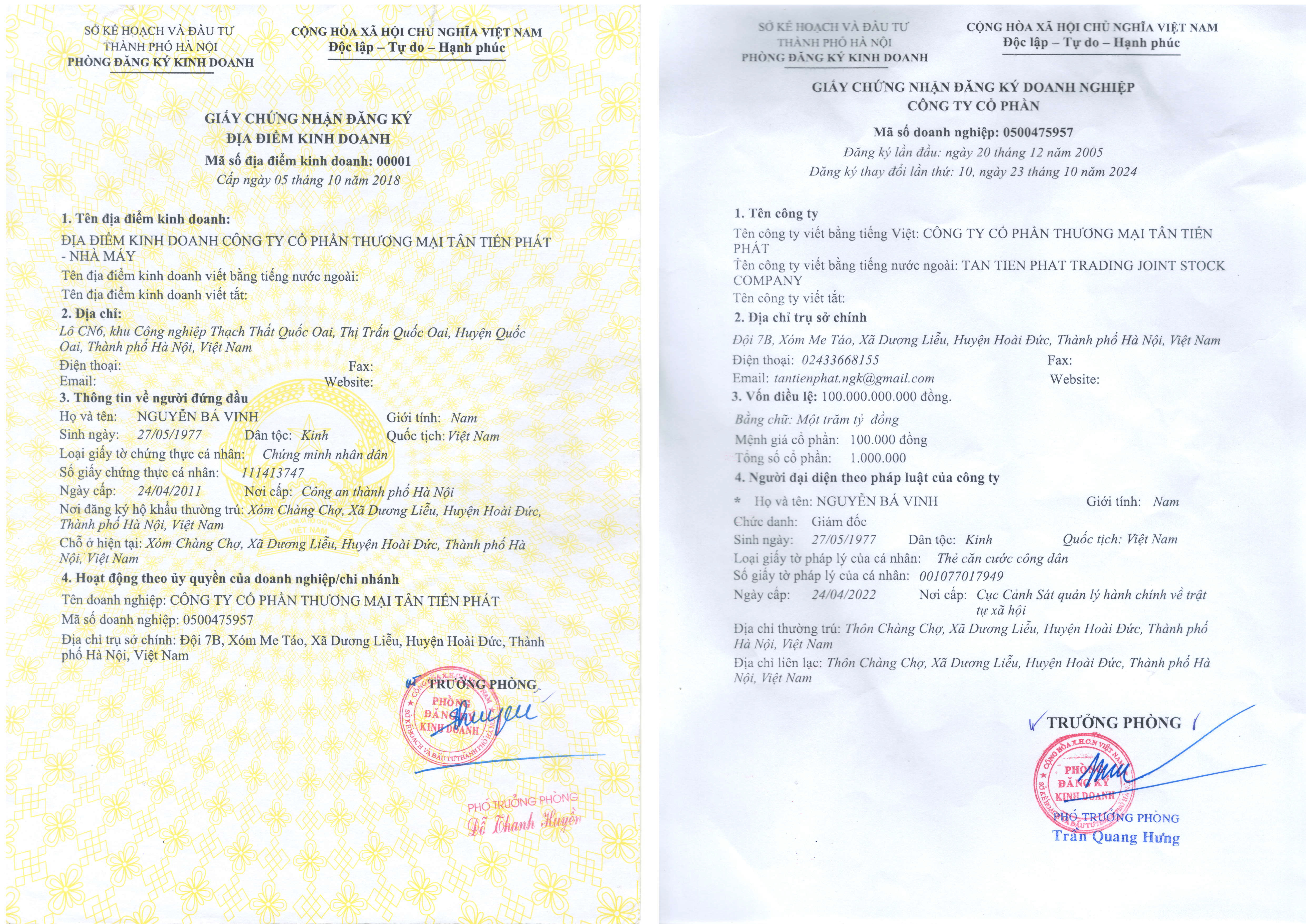ĐC: Đội 7B, thôn Me Táo, xã Dương Liễu,huyện Hoài Đức, TP Hà Nội NM: Lô CN6, khu CN Thạch Thất - Quốc Oai, TP. Hà Nội MSDN: 0500475957 ĐK lần đầu: 20/12/2015 ĐK thay đổi lần thứ 9: 08/11/2022 ISSO 22000:2018 số: HA 243-22 cấp ngày 20/09/2022 |